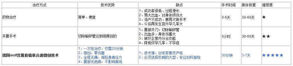 到目前为止,宫外孕的治疗方法主要有药物治疗、开腹治疗、超微创治疗这三种方法。然后这三种方式优劣各不相同,主要表现如下:
